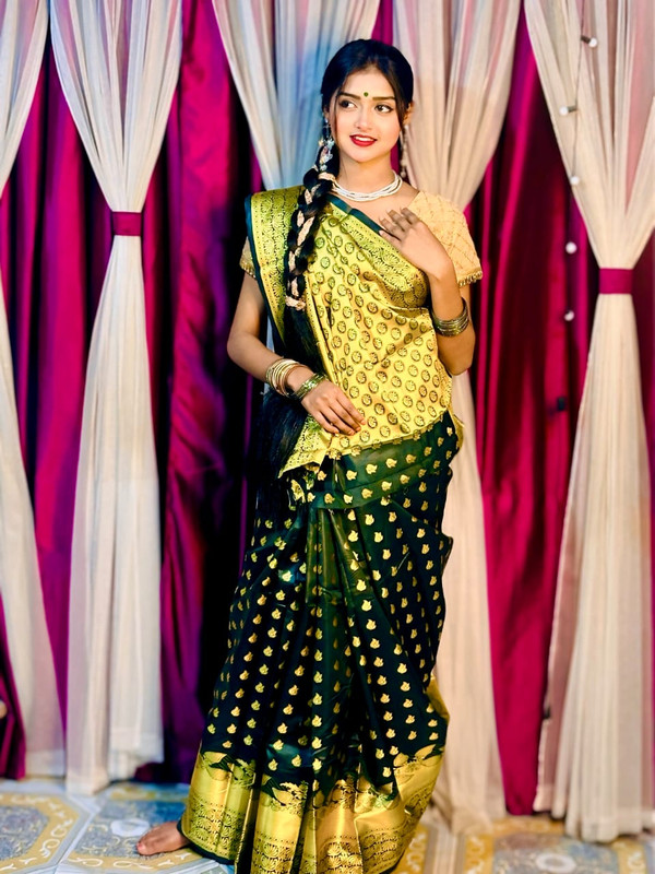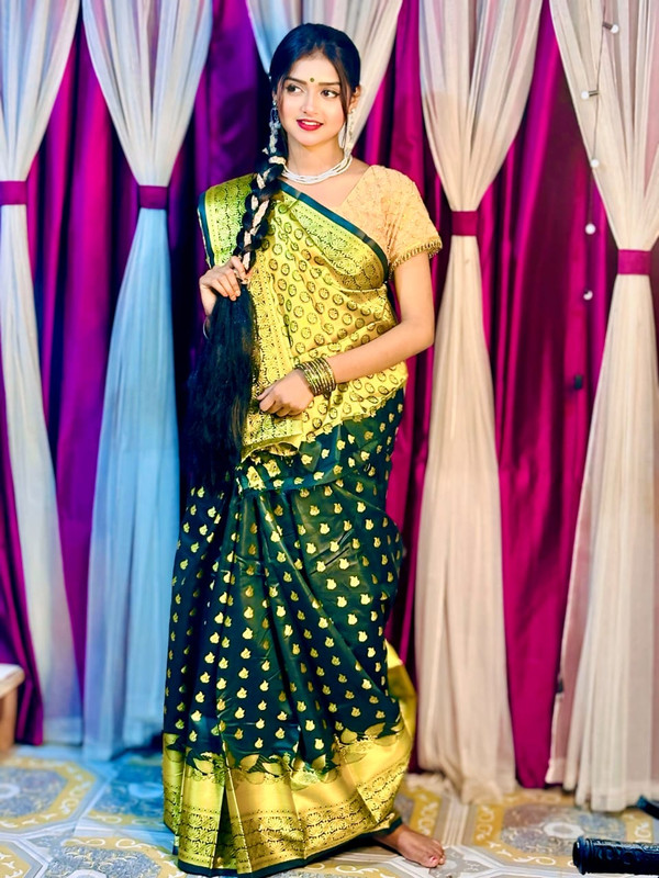 তাঁতিদের বানানো সিল্ক কাতান বেনারসি শাড়ি।