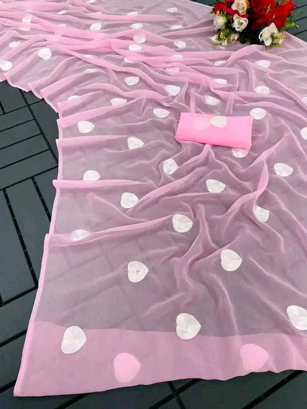 ফেব্রিক্সঃ জর্জেট কাপড়। সাথে ব্লাউজ পিস থাকবে। পুরো বডিতে লাভ এমব্রয়ডারি কাজ করা। প্রিমিয়াম কোয়ালিটির শাড়ি।