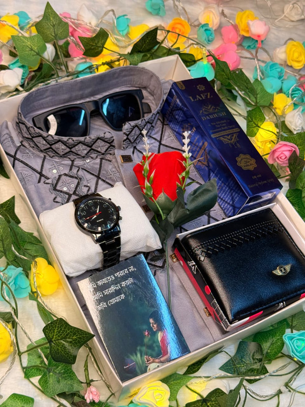 সিকুয়েন্স পাঞ্জাবি কম্বো সেট ঘড়ি,মানিব্যাগ,পারফিউম, সানগ্লাস ফুল গিফট কার্ড,গিফট বক্স। ফেব্রিক্স সুতি কাপড় স্নাপ বাটন সাইজ M/L/XL